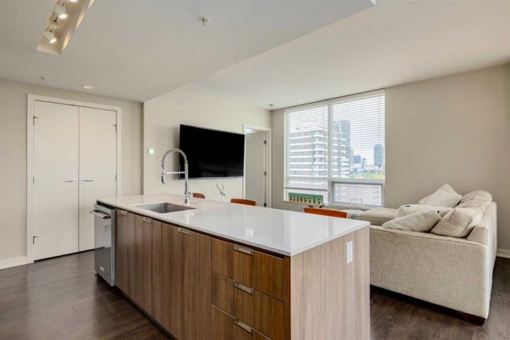Perched on the 9th floor with sunny south and east views of the downtown core and the sunny south towards the Elbow river, this corner unit is a must see. Calla is a long-time favourite in the Beltline for its location and walkability to downtown and 17 Avenue. This 2-bedroom, 2-bathroom layout is a favourite in the building as it is one of the largest floorplans in the building and rarely these style units come available. With 961 square feet, large windows, and consistent sun exposure. It is an ideal space for someone who enjoys everything inner city life has to offer. As you enter this floorplan foyer creates a defined entry away from the main living area. The open concept living space is functional and bright. Floor to ceiling windows showcase the downtown skyline which can be enjoyed both day and night. Dark espresso laminate floors pair with the kitchen, which features a large quartz island and well-appointed storage. The kitchen flows to the dining and living areas and opens to a private SE balcony with room to relax as well as space for a barbecue. The two bedrooms sit on opposite sides of the unit, which is an ideal layout. The primary bedroom has a walkthrough closet and a 4-piece ensuite with a stand-up shower and soaker tub. The second bedroom is spacious and works well as a bedroom, office or flex room. A walk-through closet connects to a 3-piece bath. In suite laundry and strong storage complete the interior. This unit has had some recent updates which include fresh paint, new carpet, new washer/dryer, upgraded faucets, central AC and more. Calla provides great amenities such as concierge, a fitness room, yoga space, sauna, guest suite, bike storage, and visitor parking plus secure storage rooms on the same floor as the unit. One titled parking stall is included. This home is ideal for singles or professional couples who want inner city convenience and to be in the heart of walkable accessibility to everything you need.
