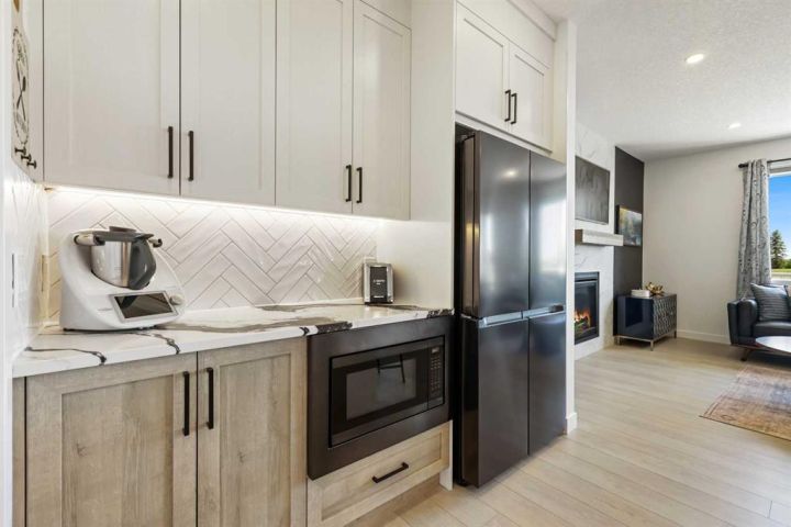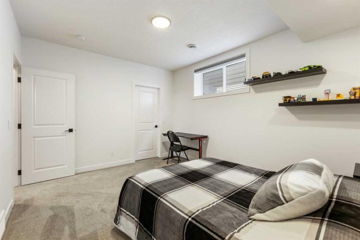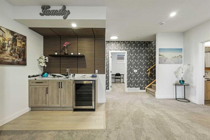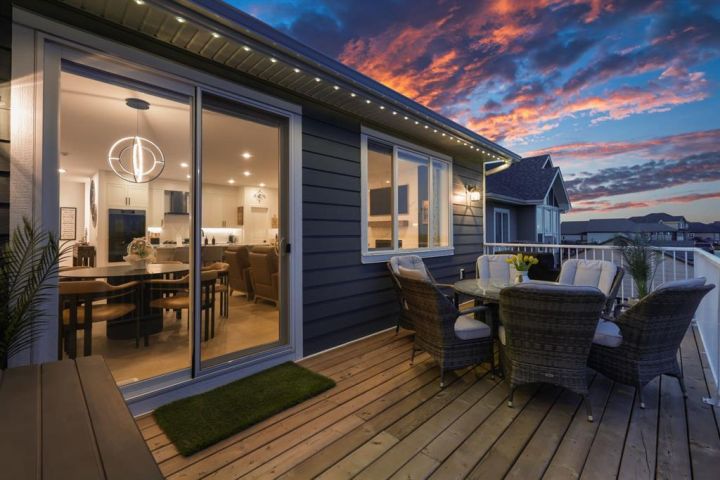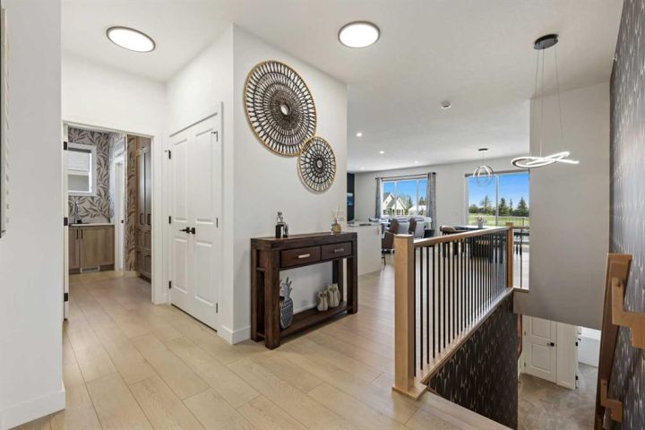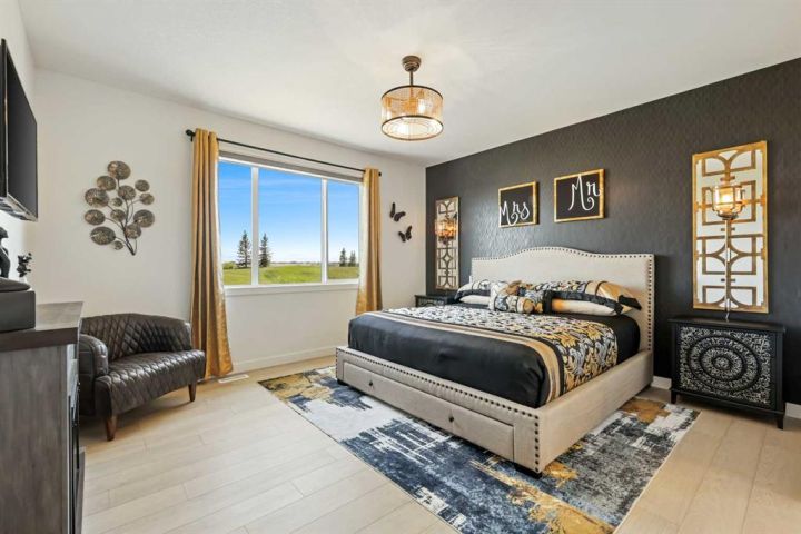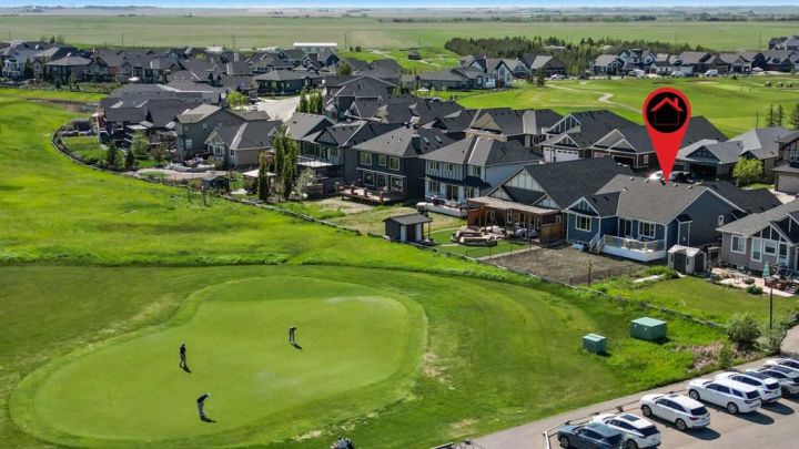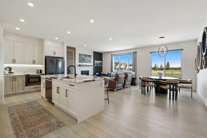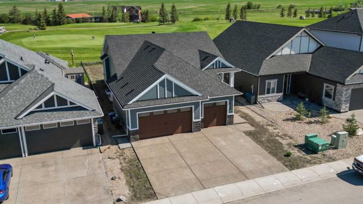 This pristine 5-bedroom, 3-bath bungalow offers a perfect blend of style, comfort, and function, ideal for families, retirees, or anyone looking to escape the buzz of the city. With James Hardie Board siding, you get lasting quality and curb appeal, further elevated by a triple car garage featuring elite walnut carriage doors, black satin windows and hardware, with epoxy finish inside the garage. The aggregate driveway and sidewalk are beautifully finished and built to last, while gemstone lighting adds charm and elegance in the evening. Inside, you're welcomed by a large foyer with stunning luxury vinyl flooring, two closets and a wide-open layout filled with natural light. The open-concept kitchen includes a large island, quartz countertops, gas stove, double oven, upgraded hood fan, herringbone backsplash, upgraded lighting, and a walk-through pantry leading to a mud/laundry room with a sink, built-in shelving, and cupboards. The living room features a gas fireplace and a stylish feature wall, with patio doors opening to a back deck perfect for BBQs, relaxing with friends, or practicing your putting. The primary bedroom is a private retreat with a large soaker tub, walk-in shower with quartz bench, private toilet room, and a spacious walk-in closet. Also on the main floor is another bedroom and a 4-piece bath. Downstairs, enjoy a comfortable basement with upgraded carpet and 10lb underlay, a large family room with a wet bar, three spacious bedrooms, a 4-piece bathroom, and a sizable utility room with extra storage. With thoughtful upgrades throughout, this move-in-ready home is a showstopper. Located just 25 minutes to Calgary or 20 minutes to Strathmore, this is an incredible opportunity to own a high-quality home in a peaceful community—contact your agent today for a private showing.