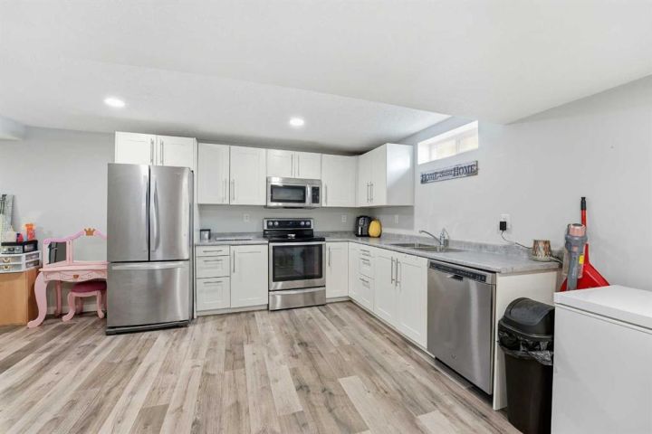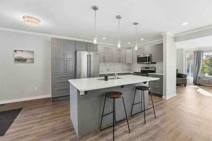 A legally suited home in Bower! The curb appeal is accented by the dark vinyl siding. The front entryway greets you to the living room that has vinyl plank flooring that runs through to the dining room. Newer (2019-2020) grey toned soft close kitchen cabinets are complemented by quartz countertops, stainless steel appliances, pantry style cupboards, full tile backsplash, an island eating bar and patio doors out to the back deck. There is a family room with a wood burning fireplace featuring a painted brick surround. The primary bedroom has his/hers closets, a fan, a vinyl window and a 3 piece ensuite with granite countertops. There are 2 additional bedrooms and a 4 piece bathroom with granite countertops. There is a back entryway that leads to the basement with a shared laundry area. The legal suite has a large family room, a games area, a dining room, a kitchen with white cabinets & stainless steel appliances, 2 bedrooms and a 4 piece bathroom with a furniture style vanity. The fully landscaped yard is fenced, has a double car garage & additional parking. A fantastic location minutes from walking trails, parks and amenities. Most interior renovations including the suite were done between 2018-2020.