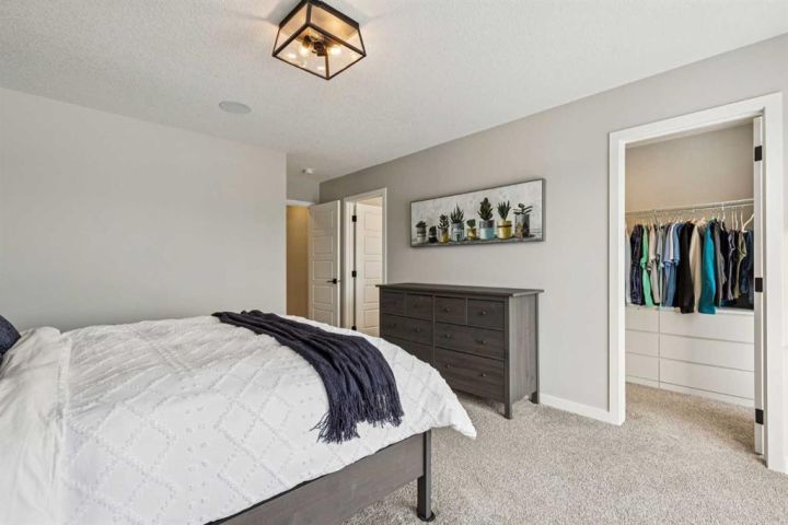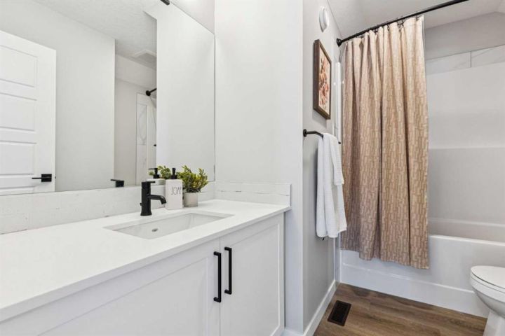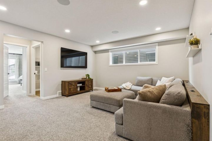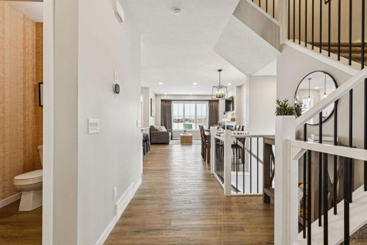 Welcome to this stunning FORMER SHOW HOME, 3-STOREY CORNER-LOT home in Heartland, offering exceptional style, thoughtful upgrades, and unbeatable MOUNTAIN VIEWS FROM EVERY LEVEL. Perfectly positioned backing onto GREEN SPACE, this property features a fully fenced WEST-FACING BACKYARD, complete with a spacious DECK. Step inside to a bright and airy main floor with LARGE WINDOWS, BUILT-IN SPEAKERS (requires Sonos amp to run them), and a sleek ELECTRIC FIREPLACE with a FLOATING MANTLE. The modern kitchen is designed for everyday living and entertaining, featuring stainless steel appliances including a BUILT-IN WALL OVEN and MICROWAVE, plus a fridge and dishwasher. A WALKTHROUGH PANTRY flows seamlessly into the mudroom for added convenience. Thoughtful touches throughout include BUILT-IN GATES that match the railing on all stairways—ideal for families and pets. Upstairs on the second level, you’ll find a spacious BONUS ROOM, a well-appointed LAUNDRY ROOM with WIRE SHELVING, and three bedrooms. The primary bedroom impresses with a stylish FEATURE WALL, a bright WALK-IN CLOSET with a WINDOW, and a luxurious 5PC ENSUITE with a TILED SHOWER, SOAKING TUB, DUAL SINKS with QUARTZ COUNTERS, and a STANDALONE SHOWER. The two additional bedrooms each offer WALK-IN CLOSETS, BUILT-INS, and MOUNTAIN VIEWS—one with its own charming FEATURE WALL. A 4PC MAIN BATH with QUARTZ COUNTERS completes this floor. The THIRD-LEVEL LOFT is a fantastic bonus space, offering a versatile BONUS/PLAY AREA, an ADDITIONAL BEDROOM, and a 4PC BATHROOM—all enjoying ELEVATED MOUNTAIN VIEWS. The basement is finished to below and left UNFINISHED, providing great potential along with a SIDE ENTRY—perfect for future development. The insulated garage comes equipped with a bike rack, adding to the home’s functionality. Additional features include AIR CONDITIONING and beautifully completed LANDSCAPING. A rare opportunity to own a 3-storey home with this level of space, design, and views in Heartland—don’t miss it!
