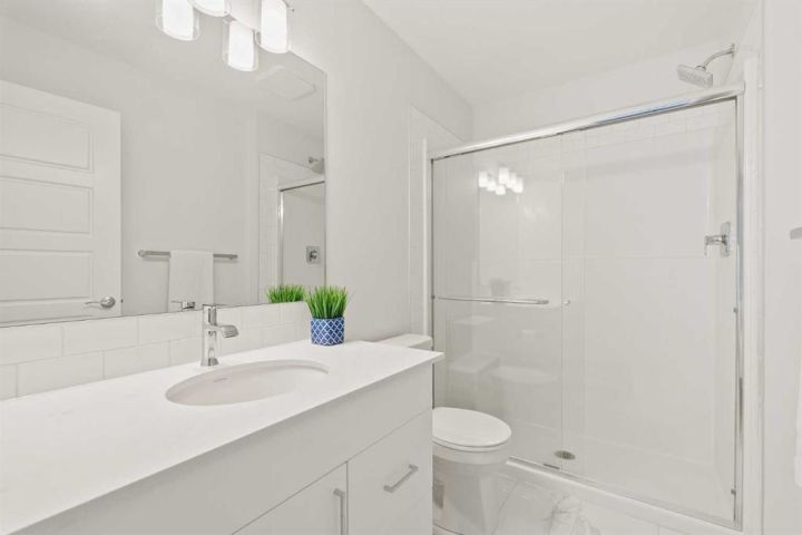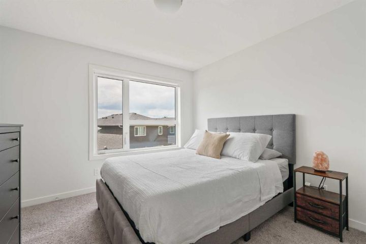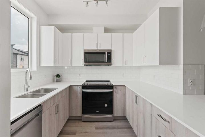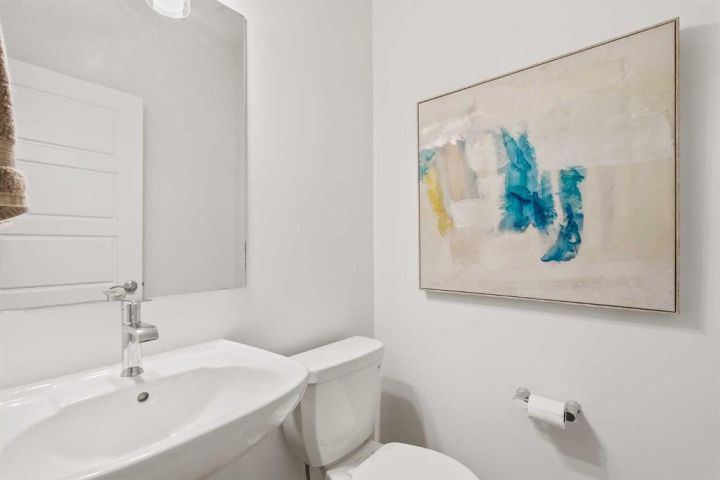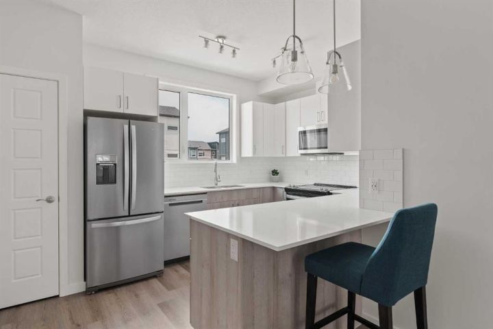 Maintenance-free living awaits in this sophisticated and modern townhome that has been lovingly cared for and is in like-new condition. Open and airy with oodles of natural light, stylish décor and a convenient dual master floor plan, this beautiful home is sure to impress. Park your vehicle safely out of the elements in the attached garage (with extra parking on the private driveway) and proceed into the entry level with a large flex space providing a ton of versatility for media, games, work or play. The second level is a stylish retreat with a bright and open floor plan leading to unobstructed conversations. Sit back and relax in the living room with an oversized window and a patio door to the expansive balcony with a gas line encouraging casual barbeques and time spent unwinding. Centring the open concept space is the dining room, perfect for entertaining. Culinary explorations are inspired in the beautiful kitchen featuring a plethora of 2-toned cabinets, stainless steel appliances, timeless subway tile and a breakfast bar that makes mornings a breeze. A handy powder room completes this level. Dual primary bedrooms grace the upper level, both are extremely spacious and bright with dual closets and private ensuites, perfect for roommates! Convenient upper level laundry adds another layer of ease to your routine. Set in an emerging, amenity-rich community with newly established schools, commercial developments, playgrounds, and green spaces, this location balances tranquillity with accessibility. Just minutes to Metis Trail, Stoney Trail, Country Hills, Costco, Cross Iron Mills, and the airport—this is truly a connected, convenient place to call home.