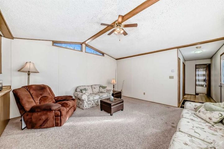 Bright, open mobile home in the adult (16+) community of Parkridge Estates. This 3 bed/2 bath home needs some cosmetic updates inside making it an ideal chance to move in and make it your own. The floor plan is sure to please with the open concept kitchen and living room. The kitchen boasts plenty of cabinet space with built in china cabinet and pantry. The primary bedroom has plenty of room for larger furniture and the 3 piece ensuite features built in soaker tub, large vanity and built in linen closet. The other end of the home has two more bedrooms and another 4 piece bath. Outside a south facing deck runs the length of the home and will be a good place to enjoy summer evenings. Imagine having your own four walls in one of the best managed mobile home communities in Calgary. This is a friendly community with a very active social committee. Activities include jam sessions, coffee meetings, pub nights, crafter circle and dinner dances. Lot fee is $820/month which includes landscaping, snow removal, waste and recycling. There is also a mandatory $25/year association fee. Pet restrictions are 2 pets per home; dogs must be less than 15 inches at the shoulder when fully grown.