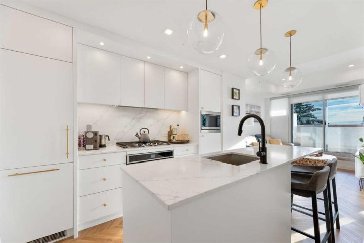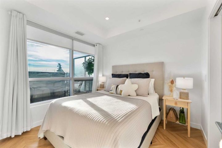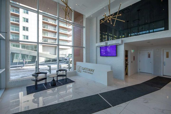 Welcome to the beautiful West! This two-bedroom, two-bathroom residence, situated in the heart of a master planned community, boasts desirable south exposure and southwest mountain views. This quiet, concrete building offers a chic aesthetic with high-end finishes, including air conditioning, luxury wide flooring (no carpets), and elegant penny round mosaic tiles in all baths. Enjoy bright and functional living with pot lights, 9-foot painted ceilings, and a luxurious white kitchen featuring brushed gold hardware, a high-end gas cooktop, wall oven, an integrated 36" Fisher & Paykel fridge, panelled dishwasher, and soft-close custom cabinetry with under-cabinet lighting. Quartz countertops and backsplash add a touch of sophistication. Downstairs, vibrant shopping, dining, fitness centres, and everyday amenities are at your doorstep. Radio Park is nearby, and you are close to schools, transit, and all amenities, with a quick connection to Stoney Trail for heading out to the mountains. The building is impeccably maintained and includes underground parking, a dedicated storage unit, bicycle storage, concierge service during the day, and underground visitor parking.