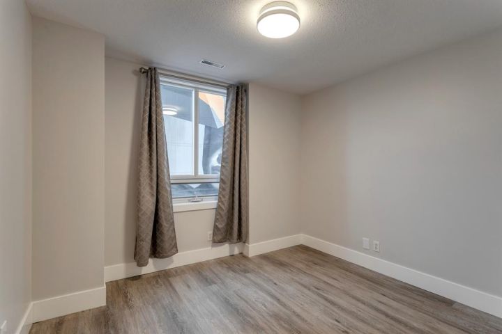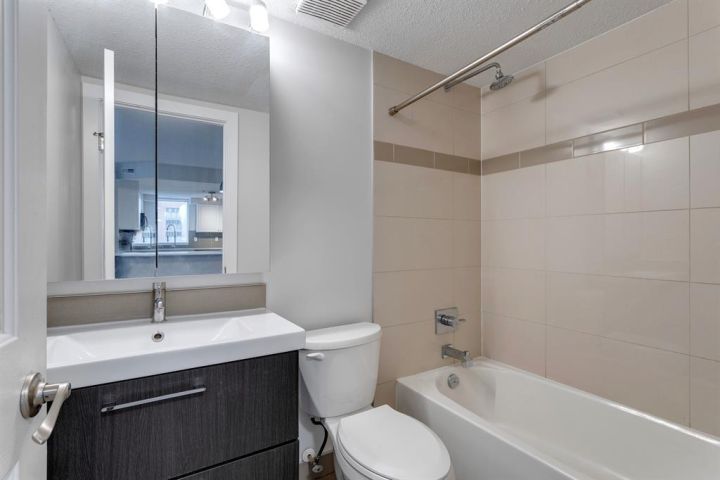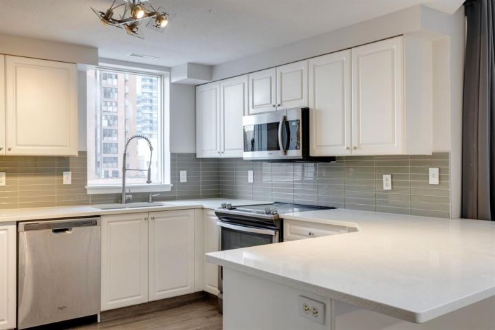 Available for immediate Possession! Freshly painted, substantially renovated 2 bedroom, 2 bathroom corner unit in Downtown West End. Very spacious, open concept with bright sunny west exposure & lovely river valley plus downtown views. Low maintenance laminate flooring throughout. Large peninsula kitchen with modern white cabinetry, quartz countertops, breakfast bar, stainless appliance package & a lovely window over the kitchen sink! Steps to the C-train free fare zone. This building offers security, concrete construction, underground parking plus fitness room. Walk to Kensington in 10 minutes, enjoy the Bow River pathway, restaurants and shops.