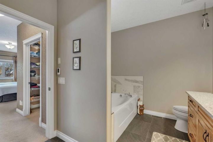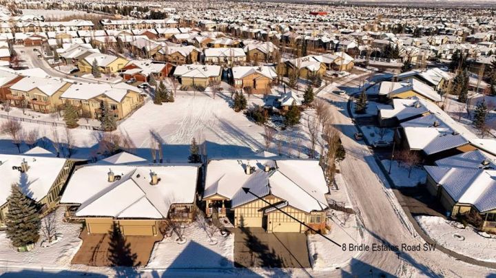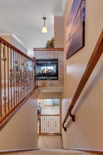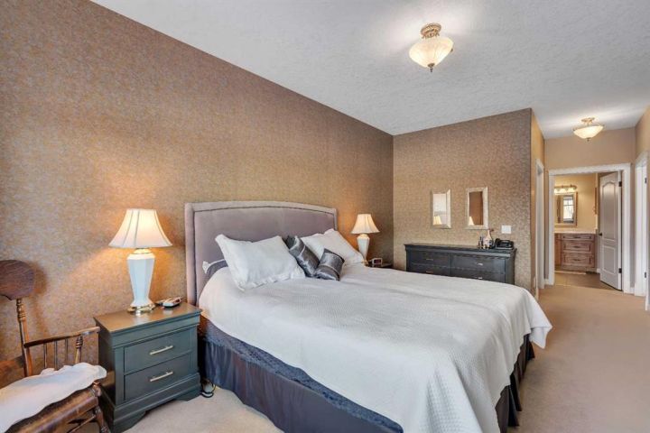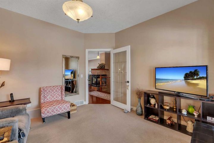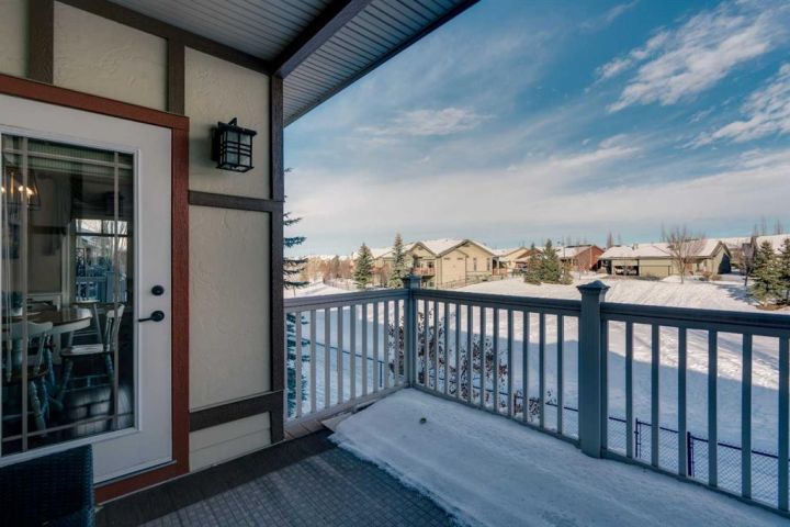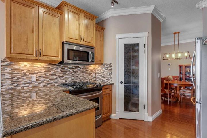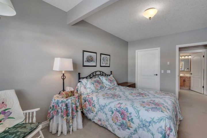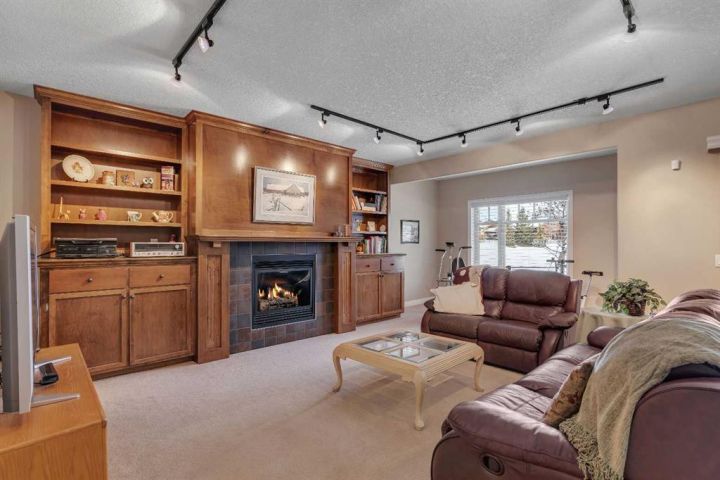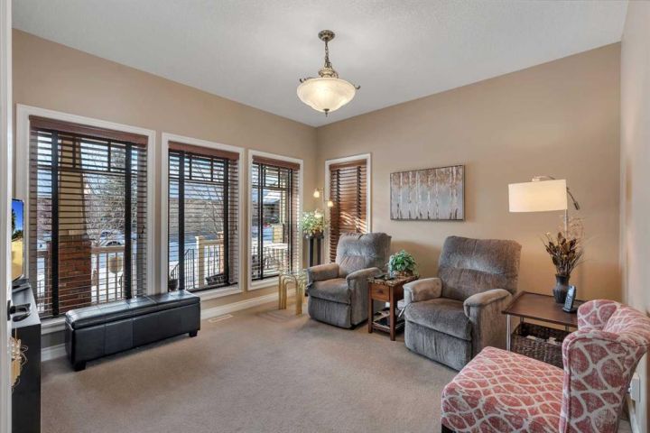 RARE OPPORTUNITY to own this immaculate 55+ walkout bungalow-style villa backing directly onto greenspace—with no neighbours behind! Tucked into one of the best locations in the community, this home is ideal for empty nesters and downsizers seeking a low-maintenance lifestyle without sacrificing space or comfort. From the moment you step inside, you’ll notice the executive upgrades including 9’ ceilings, custom crown moulding, and hardwood flooring throughout the main level. The layout is bright and functional with a spacious tiled front entry, a front den/office with large windows, and a formal dining area perfect for hosting. The kitchen offers granite countertops, corner pantry, an updated tile backsplash, and newer stainless-steel appliances including a fridge with water and ice, dishwasher, and microwave hood fan. The adjacent eating nook showcases unobstructed greenspace views and leads to the deck—a perfect spot for morning coffee or quiet evenings outdoors. The living room is warm and inviting and includes a three-way fireplace. The primary suite is a great size and features a walk-in closet and a beautifully updated ensuite with heated floors, a tiled shower and Jacuzzi tub. The main level is complete with a powder room and convenient laundry with new washer and dryer (2024). Downstairs, the walkout lower level expands your living space with a large family room featuring a gas fireplace, built-ins, a spacious additional bedroom, and a full bathroom. There’s also a versatile room that is ideal for an office, hobby space, rec room, or potentially an additional bedroom plus plenty of storage. Additional highlights include air conditioning, and a central vacuum system. Best of all: no condo fees—just a low $180 HOA fee covering lawn care, snow removal, and irrigation, making this an ideal turn-key option for those looking to simplify and enjoy life. With easy access to Stoney Trail, shopping and amenities this move in ready villa is not to be missed!