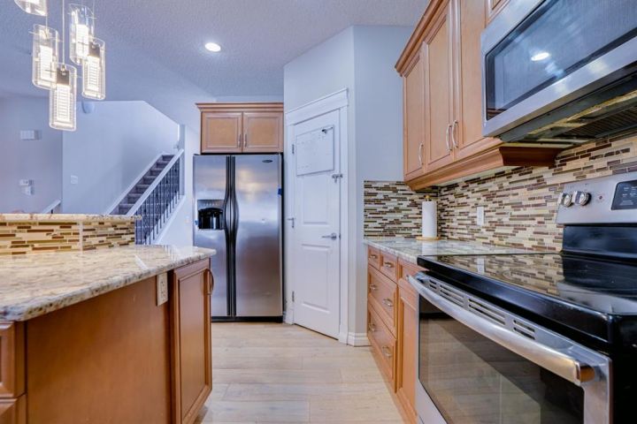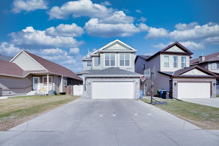 Welcome to 77 Saddleland Drive NE! This beautifully appointed, fully developed home featuring timeless design and exceptional functionality. From the moment you step inside, you’ll appreciate the open-concept floorplan, soaring 9 ft ceilings, and an abundance of natural light throughout. The main level showcases a gorgeous maple kitchen with premium granite countertops, a bright and inviting living room, and a charming dining area. A double-sided fireplace with custom built-ins adds warmth and elegance to the space. Iron spindle railings lead you upstairs to an impressive open-to-below foyer and a bright, vaulted bonus room complete with a built-in desk and integrated speakers—perfect for work or relaxation. The spacious primary bedroom offers a well-appointed ensuite, complemented by two additional generously sized bedrooms and a full 4-piece bathroom. The lower level features a well-designed one-bedroom illegal suite, ideal for extended family or potential rental income. Outside, the home is fully landscaped and fenced, with a great deck for summer BBQs. A double front-attached garage completes the package. Located within walking distance to Saddletowne Circle, C-Train access, shopping, and schools, this home offers outstanding convenience in a family-friendly community. Don’t miss this fantastic opportunity!